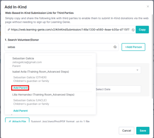 - Begin by searching for the volunteer/donor using the child or parent's name. If the individual is not found in the system, proceed by clicking on "Add Parent"