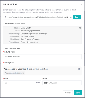 - Once the person is identified, select the relevant activity type. Provide a description for the activity. For At-Home or Volunteer activities, choose from the predefined list. For donations, specify what was contributed.