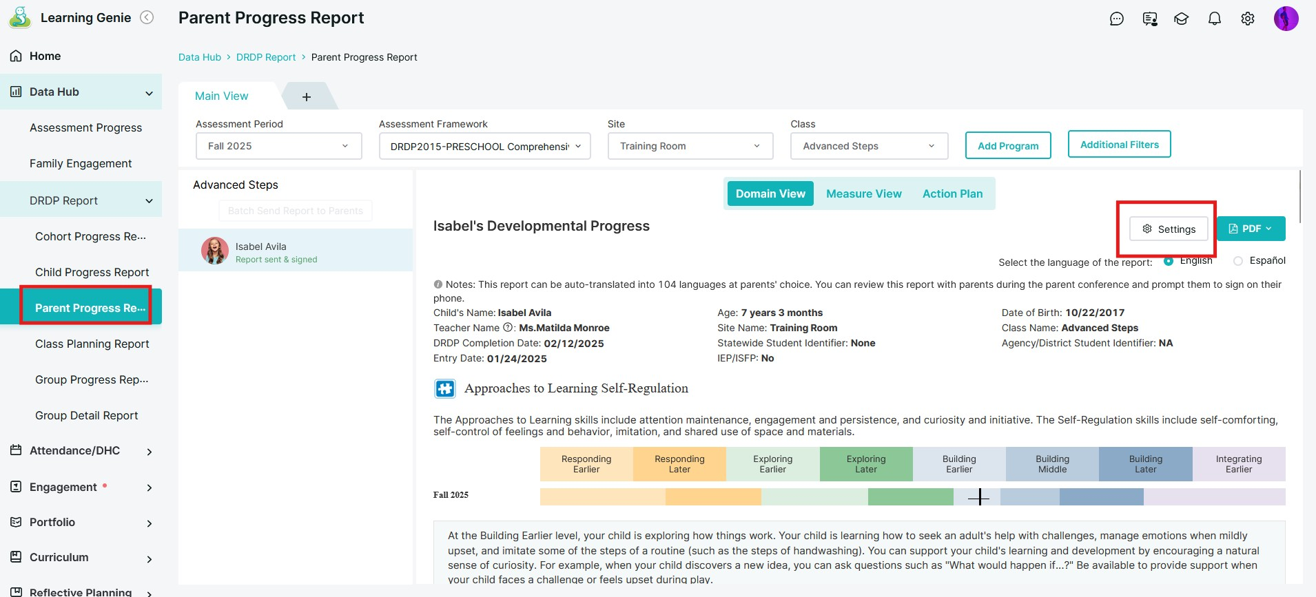 Go to Data Hub > DRDP Reports > Parent Progress Report