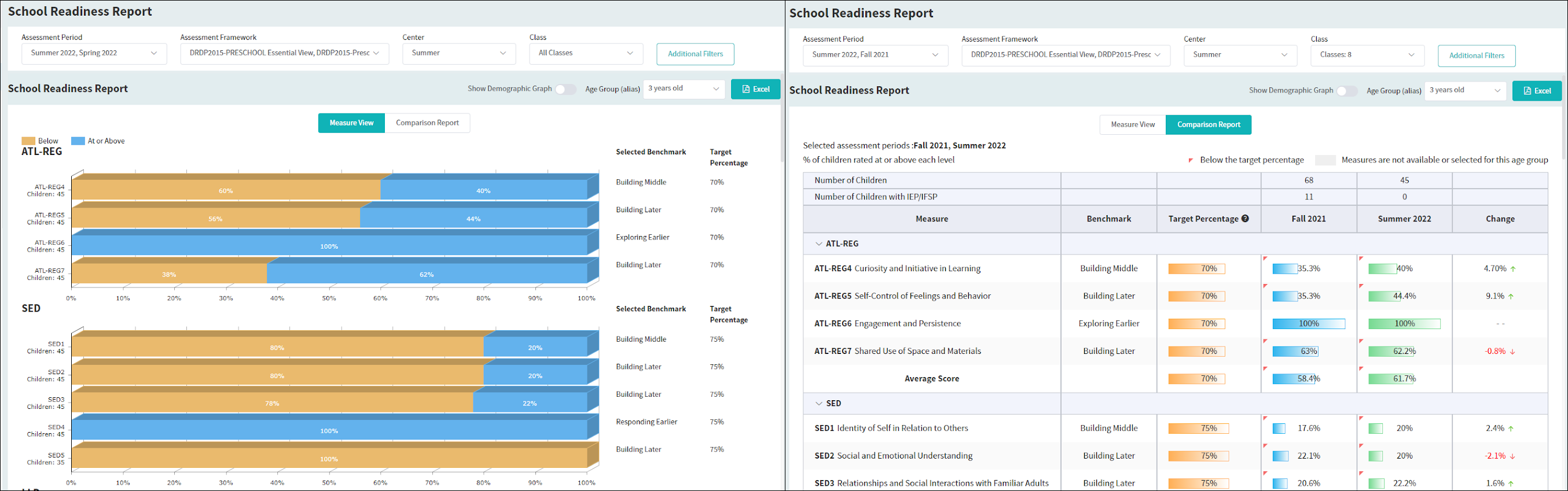 This report provides a comprehensive view of the school readiness goals you've set for each measure within different age groups and shows the percentage of children who are below, at or above these benchmarks. You can also access a detailed comparison report that tracks the progress of various age groups across rating periods, and conveniently download an Excel report for thorough analysis.