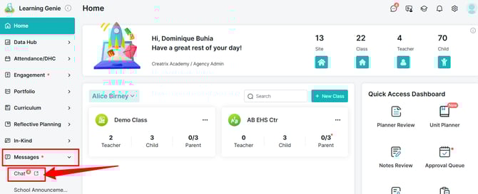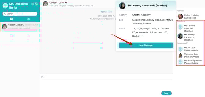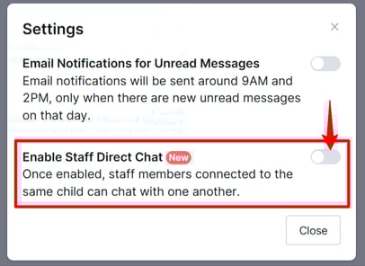Direct staff-to-staff chat is a helpful way for teachers and administrators to collaborate and communicate quickly. By enabling this feature, staff members connected to the same child can easily send messages without needing to go through families or other channels.