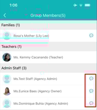Choose the staff member(s) you want to chat with. (Only staff connected to the same child will appear in the list.)In the app: Tap the “Group Members” icon in the upper-right corner.