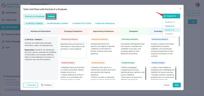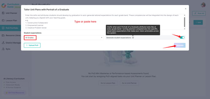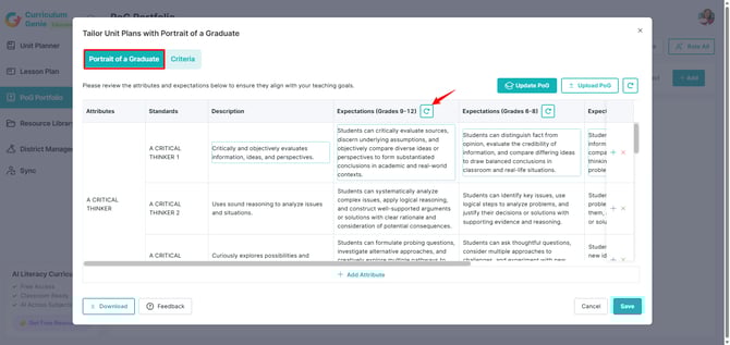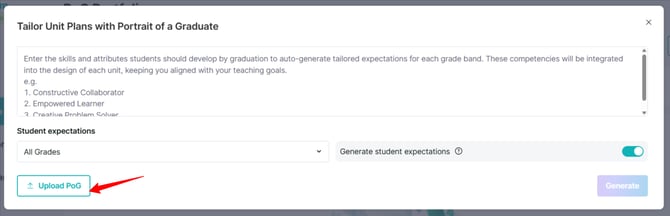 The Portrait of a Graduate (PoG) framework serves as the foundation for generating PoG-aligned Unit Planners, Lesson Plans, Performance-based Assessments, and Mini Masteries. This guide explains how to configure these attributes, actionable expectations, and rubrics in an admin account.