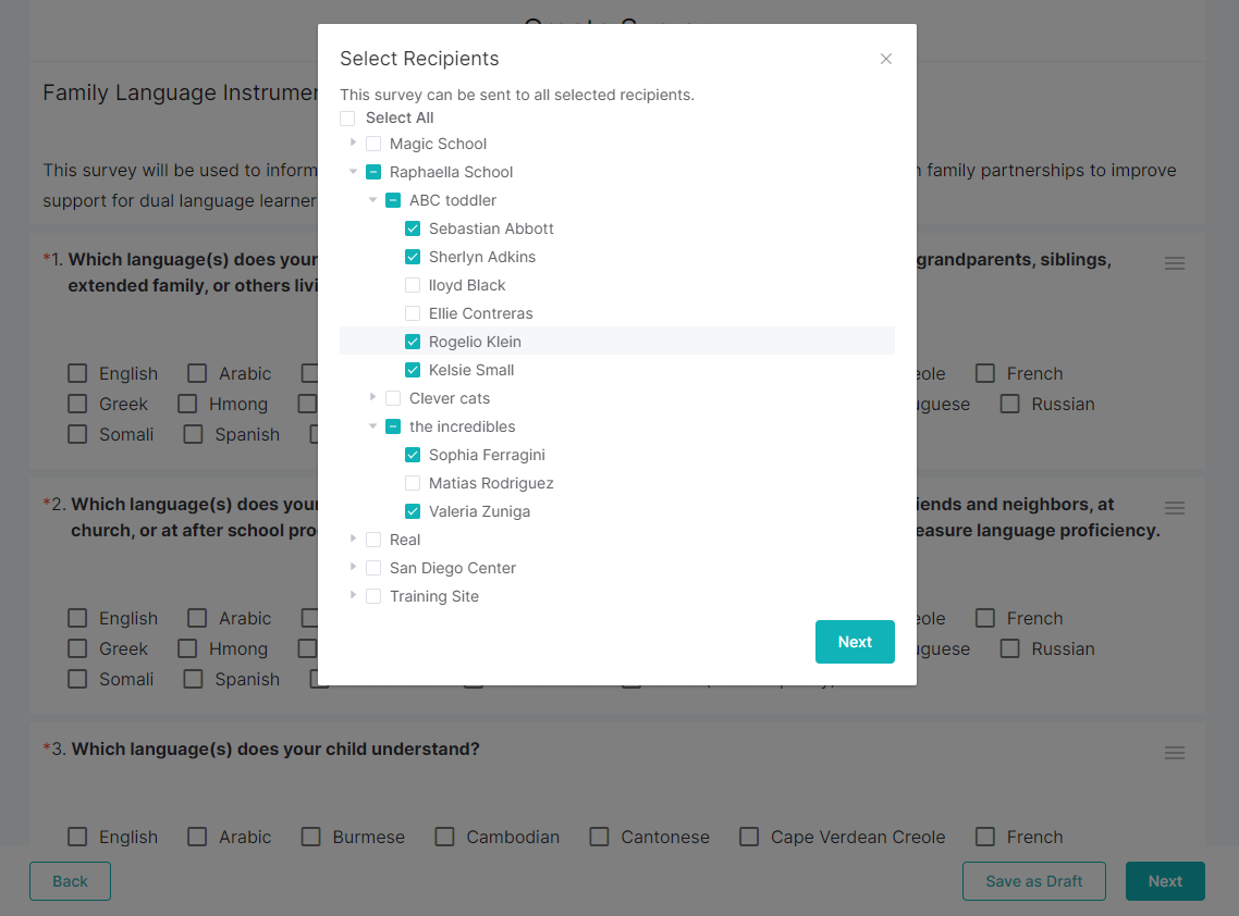 4. Select the recipients. You can send the survey to specific families, an entire class, or multiple classes. Click Next to proceed.