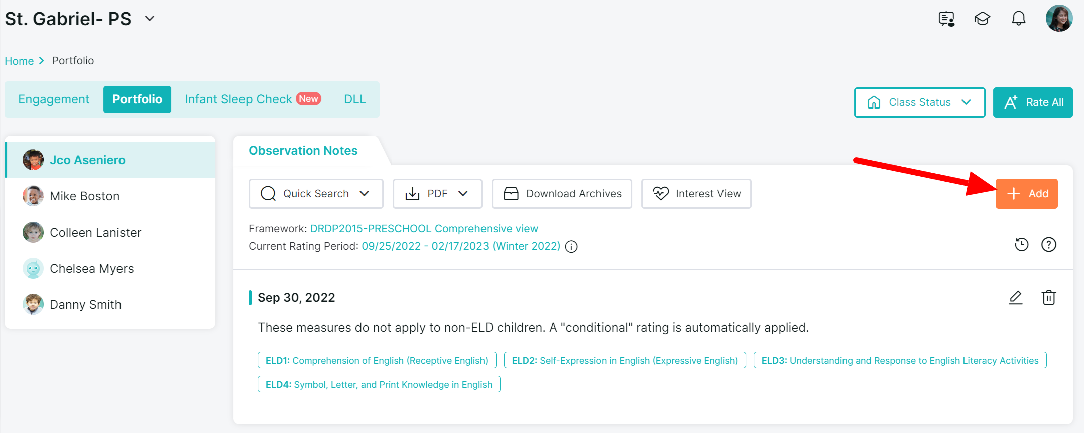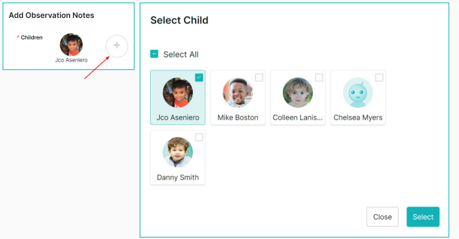 3. Click on the + button to select multiple children for the group observation note or use the "All" check box to select all children in the classroom.