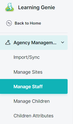 3. Click "Manage Staff" under Agency Management on the left-hand side and locate the child you wish to transfer.