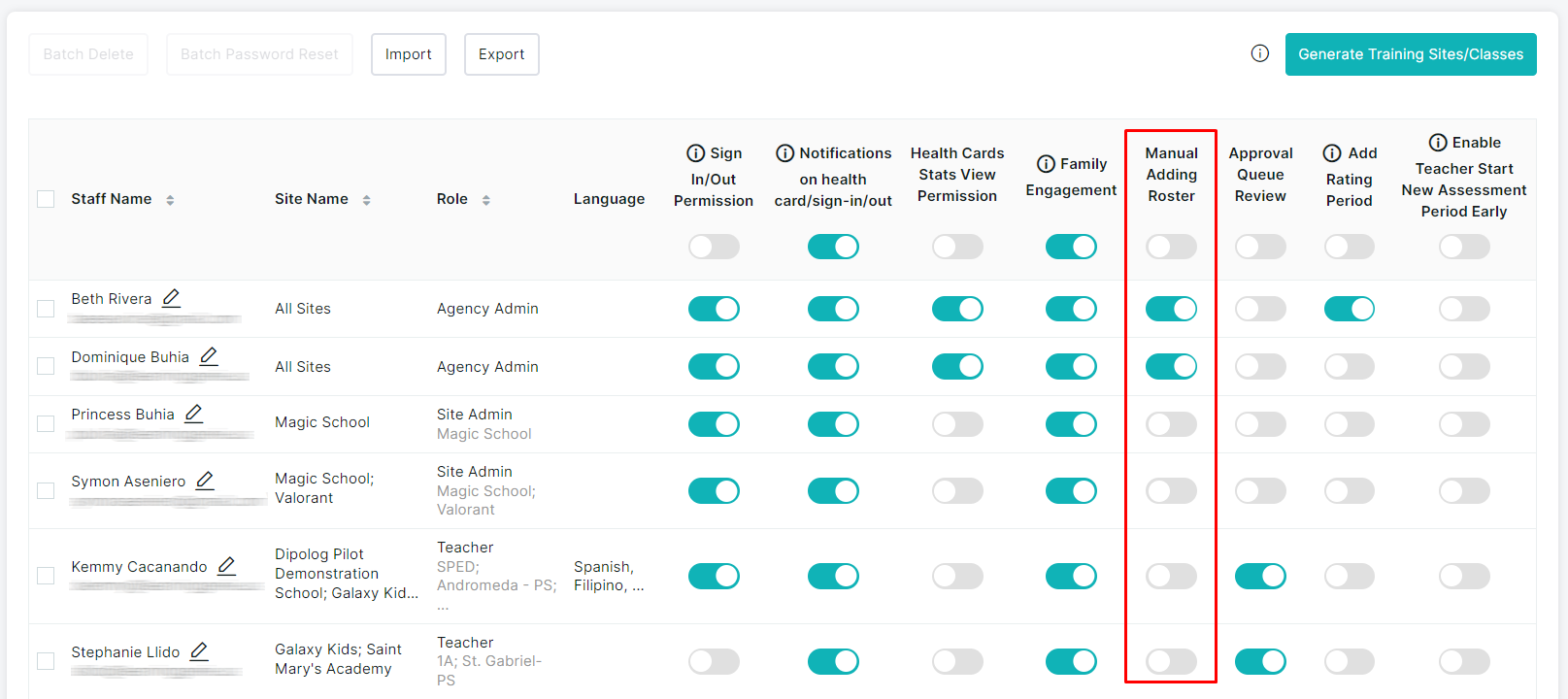 5. Under the "Manual Adding Roster" column, click the toggle to "OFF".