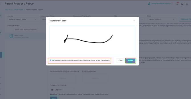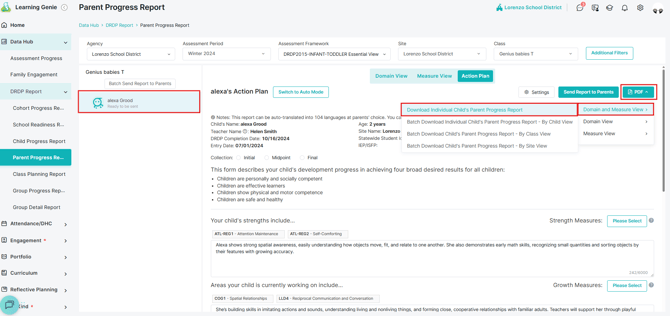 Once the Action Plan is complete, click the PDF button in the upper-right corner to download the full Parent Progress Report.