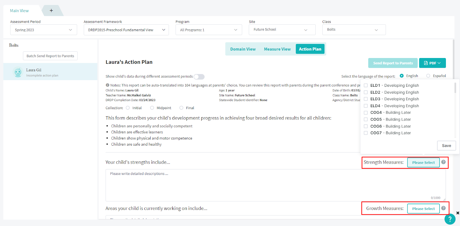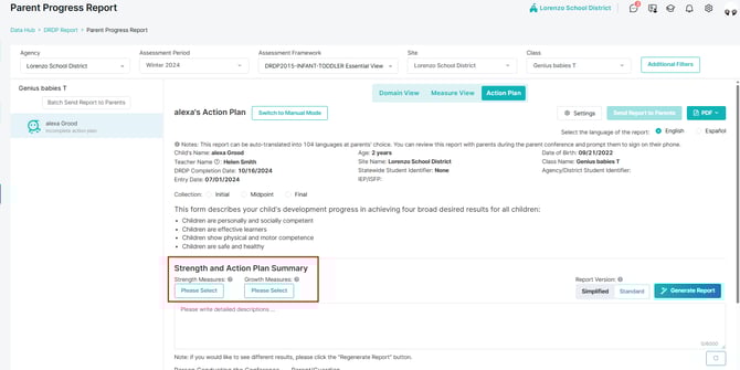 The Action Plan is part of the Parent Progress Report and is a key tool for preparing for parent-teacher conferences. It is a summary report of each child’s strengths and growth areas, based on DRDP results.