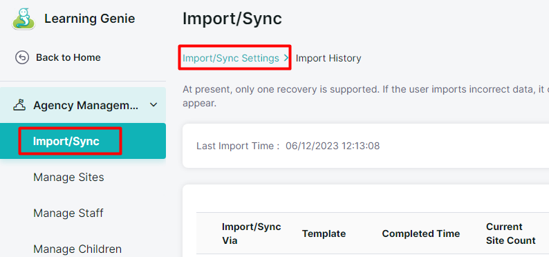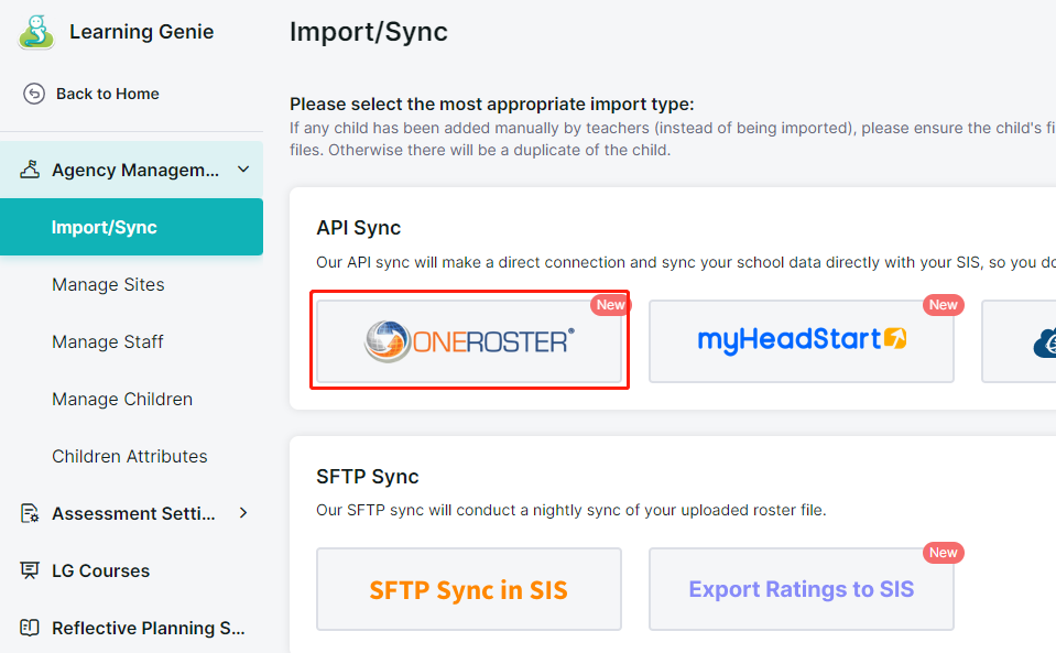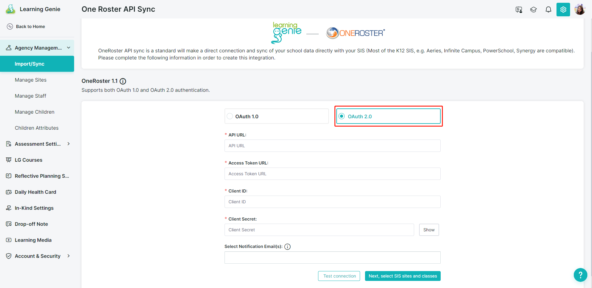 2. Go to Learning Genie > Admin Settings > Import/Sync homepage > ONE ROSTER > OAuth 2.0