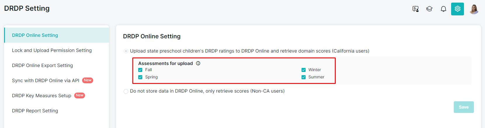 1. On DRDP Online Setting select Upload and choose the assessments you'll be uploading.
