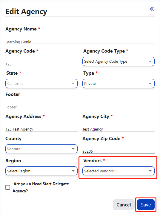 Once you fill in any required* fields like your address and zip code, click the "Vendors" drop-down menu and select Learning Genie. To save your changes, click on the "Save" button.