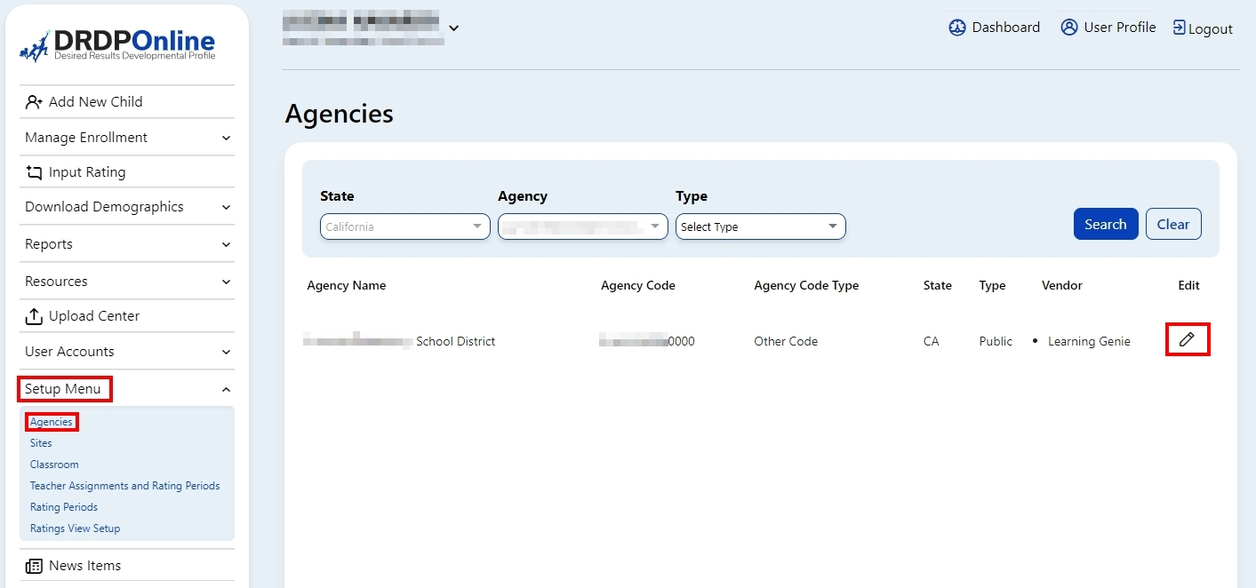 Go to Agencies under Setup Menu, click on Search, and then click the pencil icon to the right.