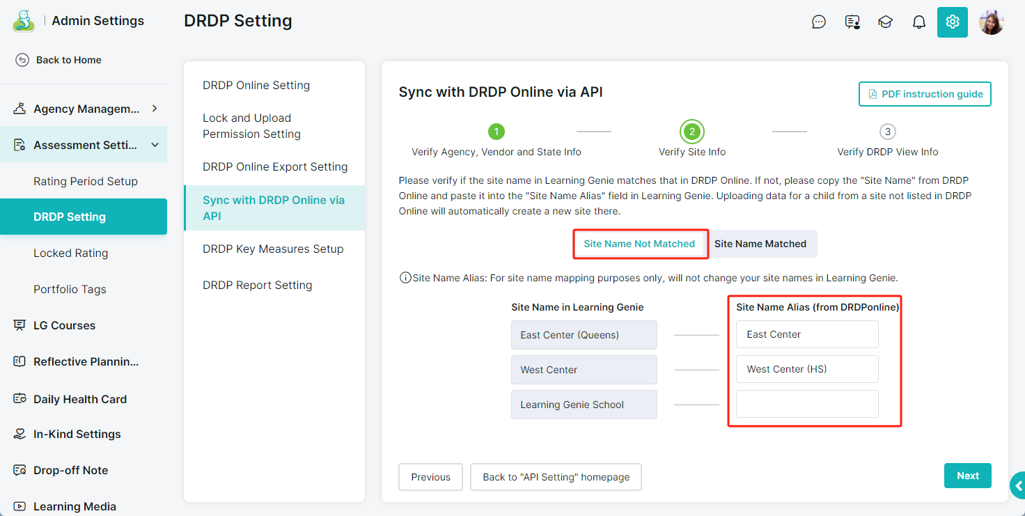 Note: If a site name on Learning Genie does not match a site in your DRDP Online, copy and paste the site name it's equivalent to on DRDP Online in the "Site Name Alias" field.