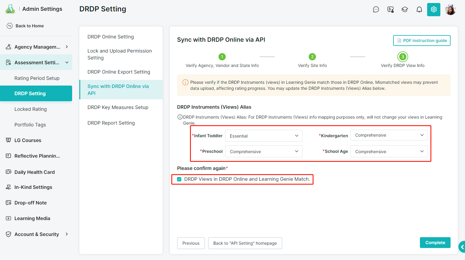 C. Verify that the DRDP Instruments (views) match in Learning Genie and DRDP Online, and confirm by ticking the check box.