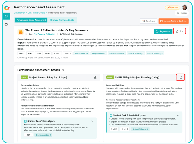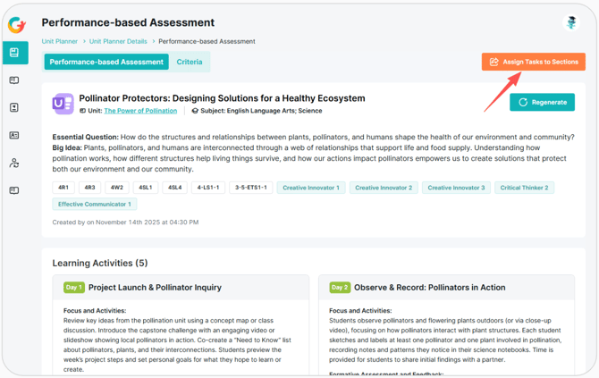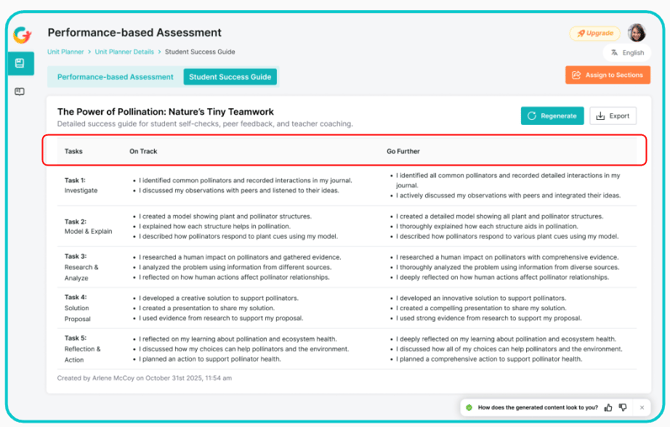 The creation process is incredibly helpful for educators because the AI does the heavy lifting: it auto-analyzes your unit plans to surface relevant standards and automatically generates tiered student success guides (from "On Track" to "Go Further"), saving you hours of preparation and rubric-building time.