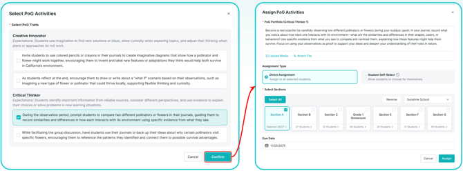 3. Review the Performance Task Overview at the bottom—an AI-generated summary of the project's goals and deliverables—and click Confirm to push it to the students' portfolios.