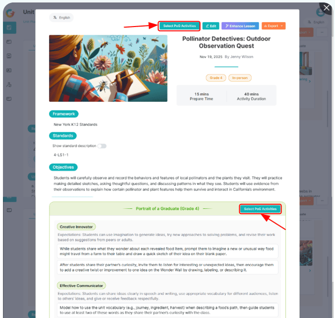 - Generate Activities: Within the lesson detail view, click the Select PoG Activities button—located either at the top of the page or next to the Teaching Tips for PoG section—to instantly generate activities relevant to the lesson's content.