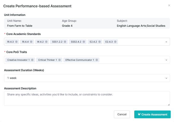 Curriculum Genie transforms static Portrait of a Graduate (PoG) frameworks into a living curriculum where competencies are intentionally practiced and measured. The platform offers two primary ways to assess these skills: comprehensive Unit-Level Performance-based Assessments (1-2 week projects), and PoG Mini Masteries (short 5-7 minute daily reflections).