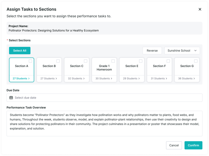 2. Select the specific classes or students who should receive the project and set an optional due date.