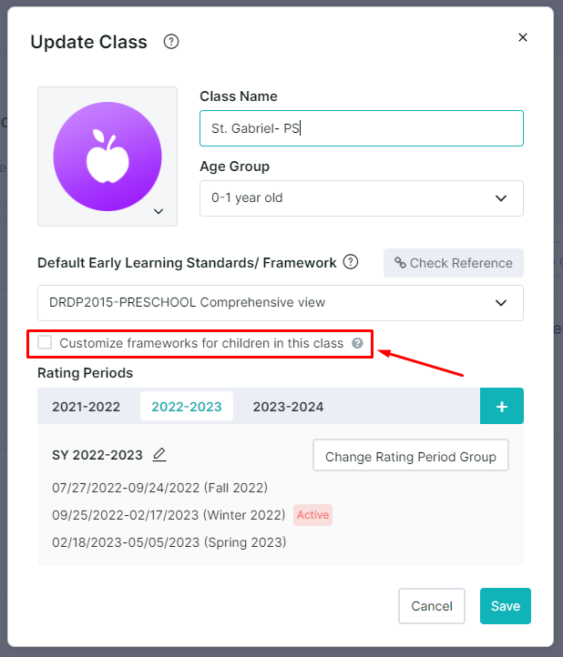 1. To use this feature, click the “Edit” button for a classroom, then check the “Customize framework for children in this class” option.