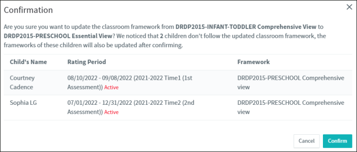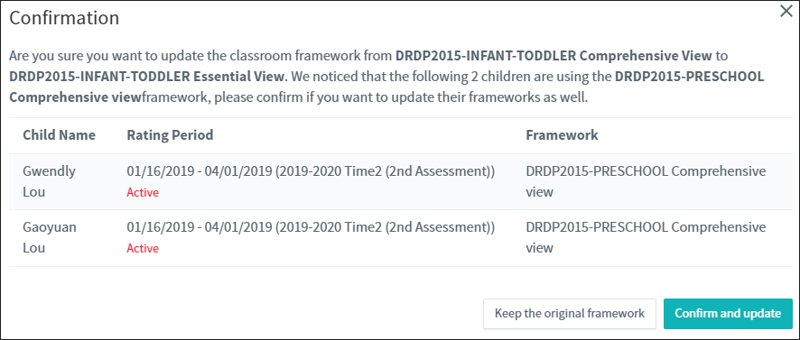 All children’s frameworks will be updated after confirmation, no matter what frameworks are used by children in this class.