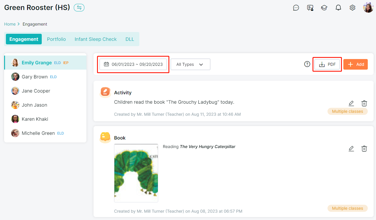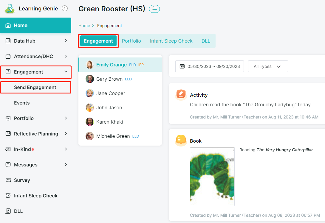 Click on the child’s classroom, then go to “Engagement.” Alternatively, you can select "Engagement" > "Send Engagement" from the sidebar, and then select a classroom to proceed.