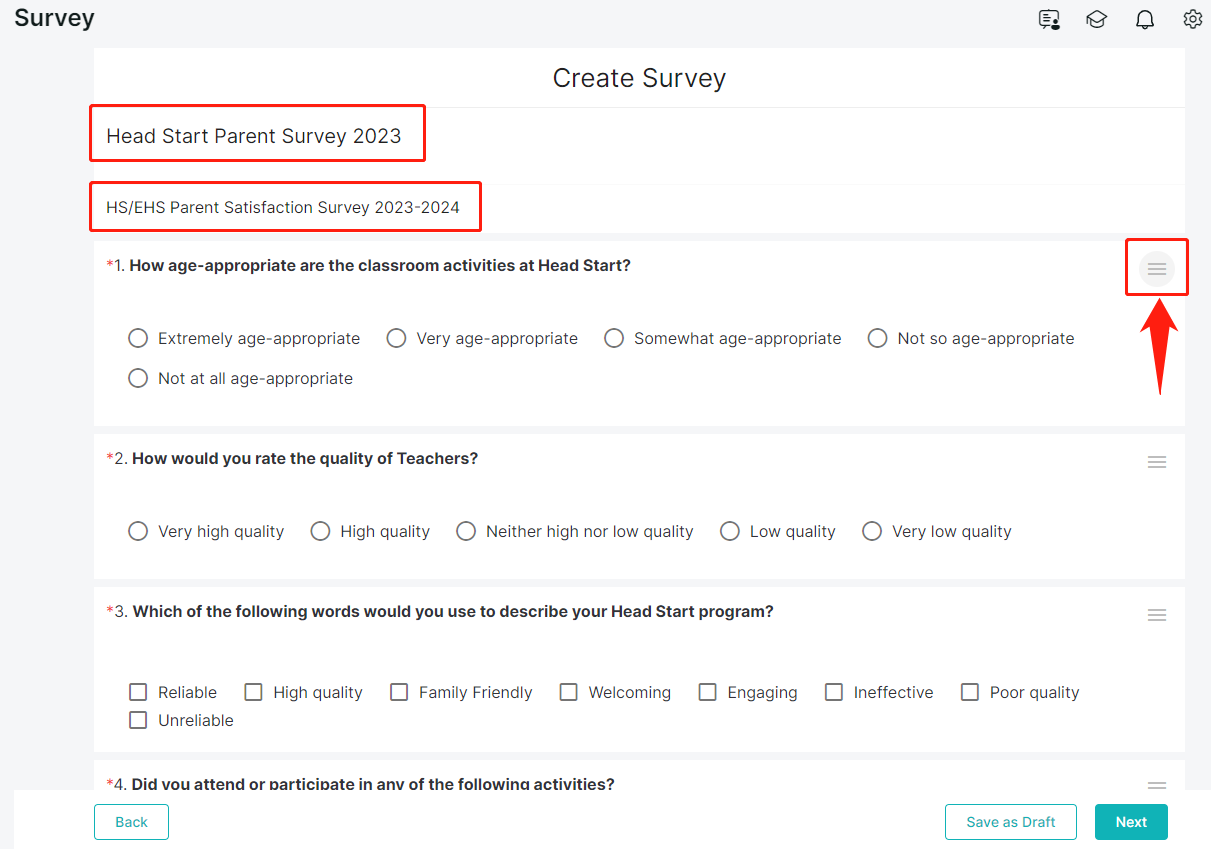 5. You can modify the title, description, questions, and answer choices for each question of the survey as needed. To make changes, simply click on the title or description to edit them: