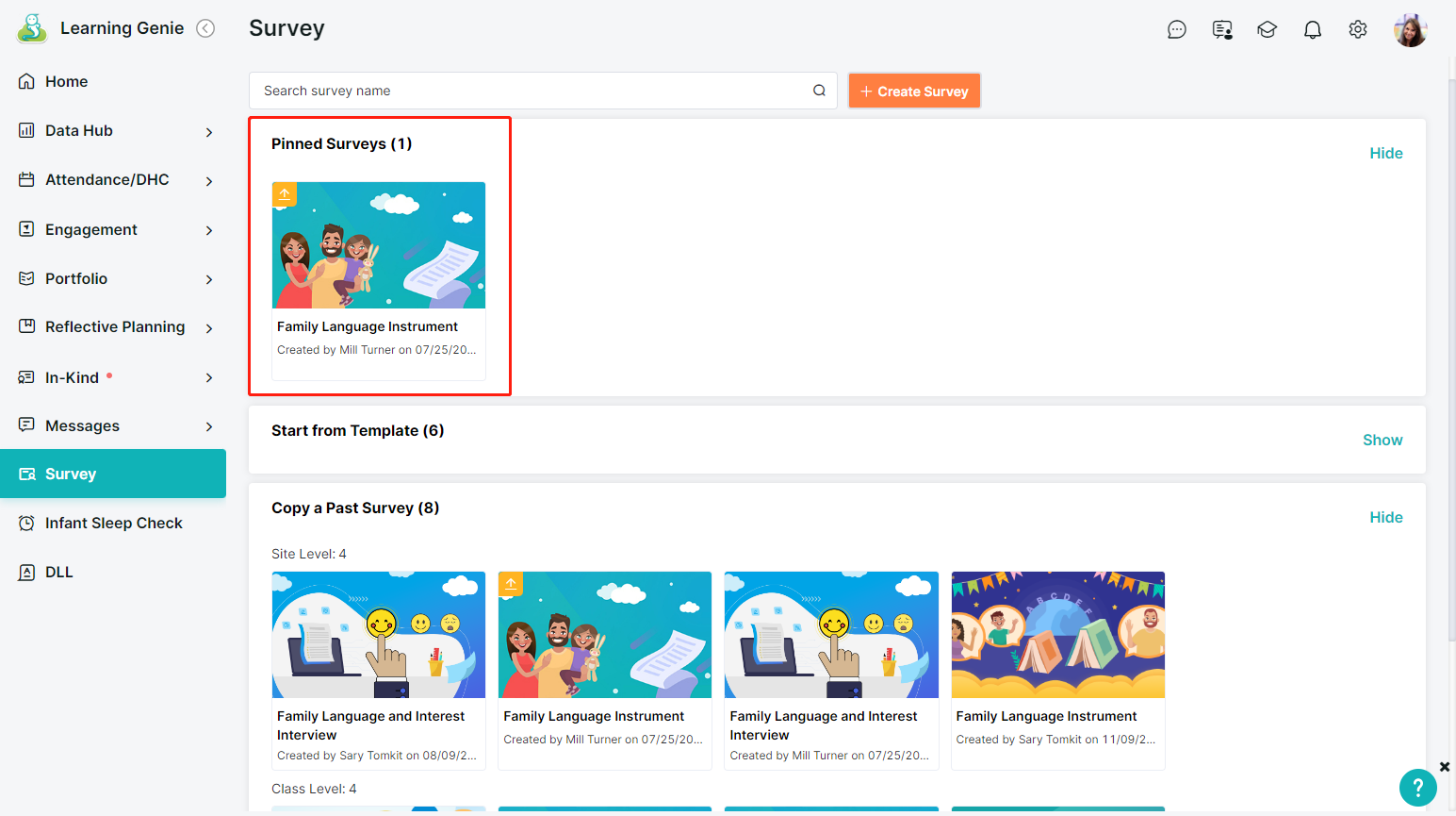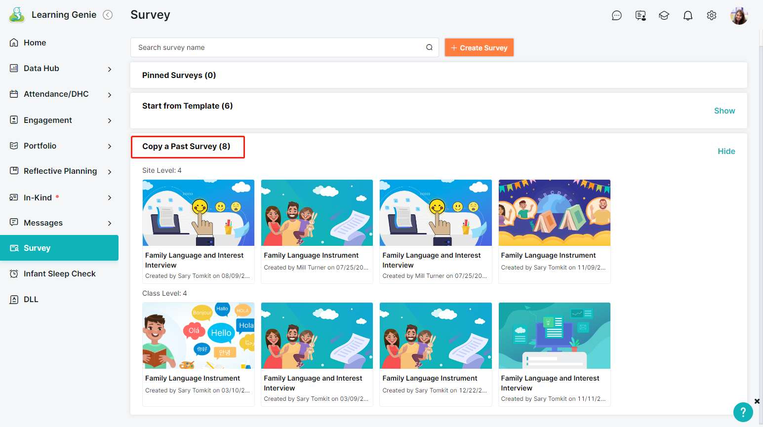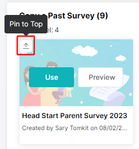 7. Find your survey template in "Copy a Past Survey" and click the up arrow icon to pin it to the top.