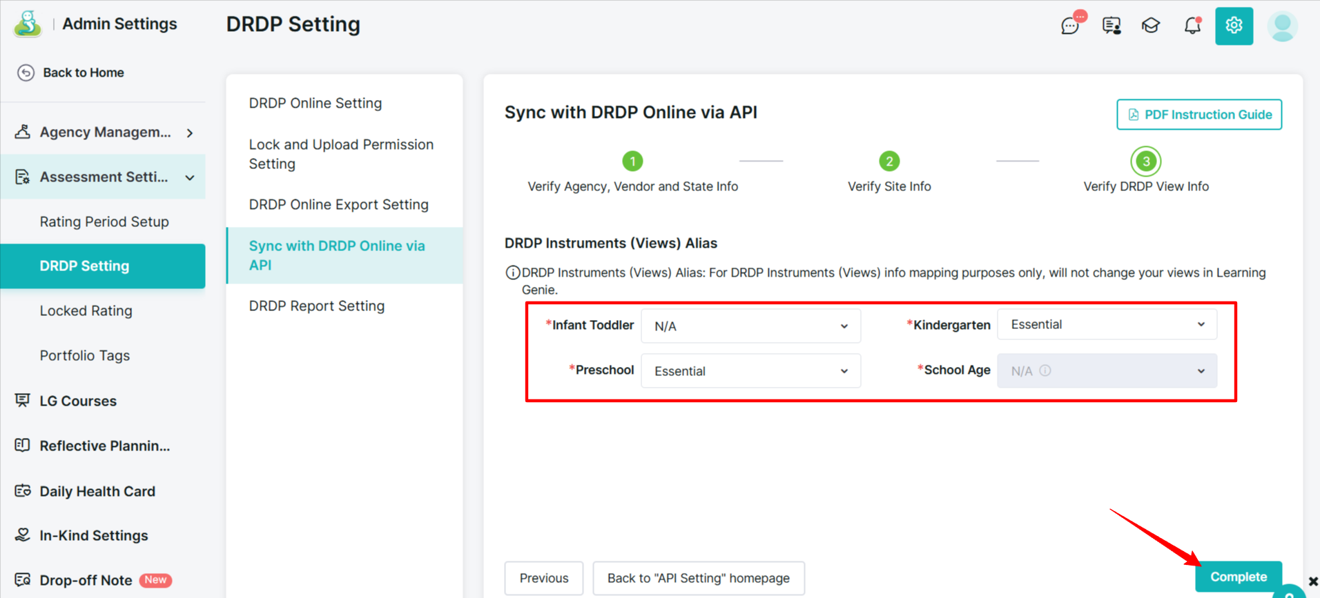 - Go to "Assessment Setting" > "DRDP Settings" in admin settings