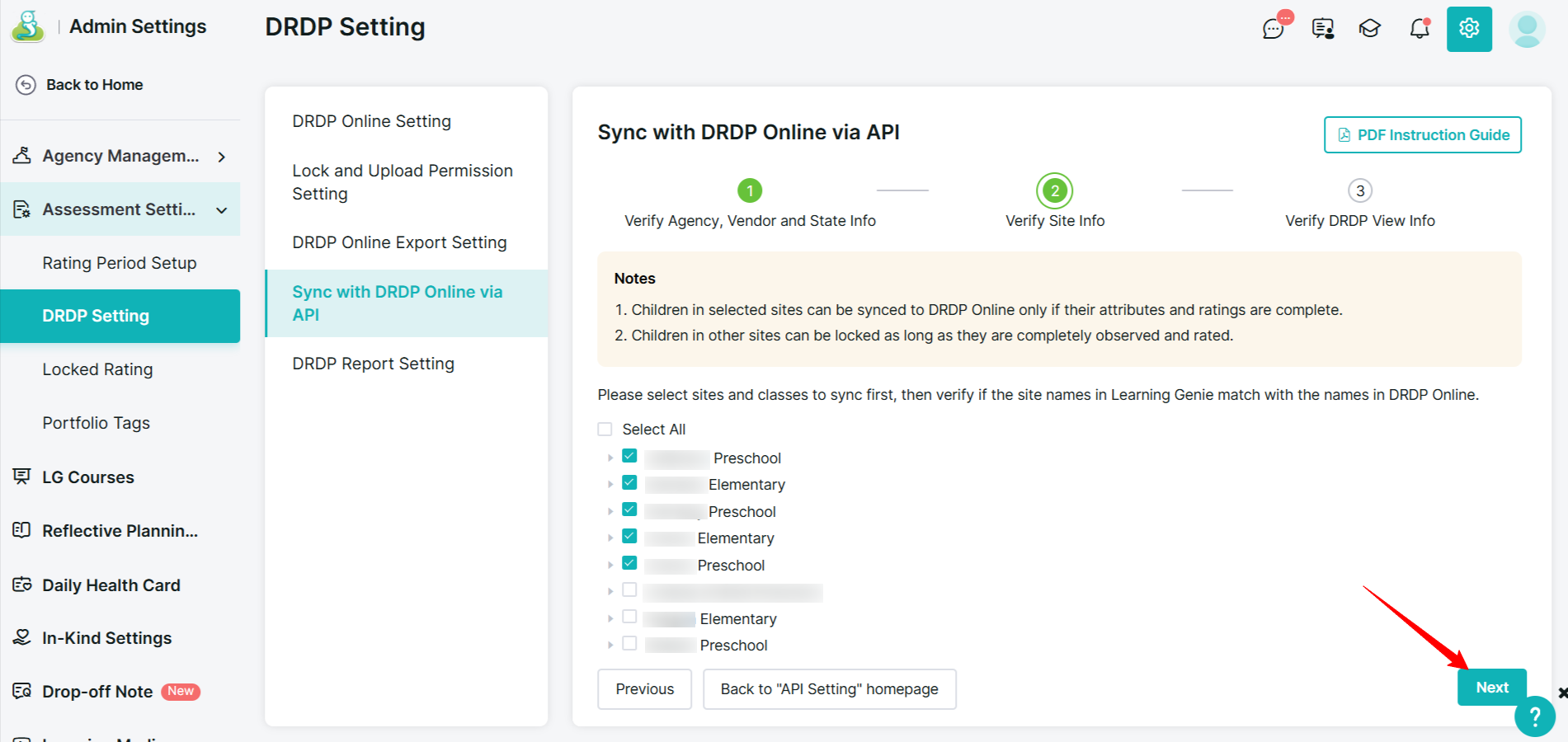 - Navigate to "Sync with DRDP Online via API" then "Update Site Info"