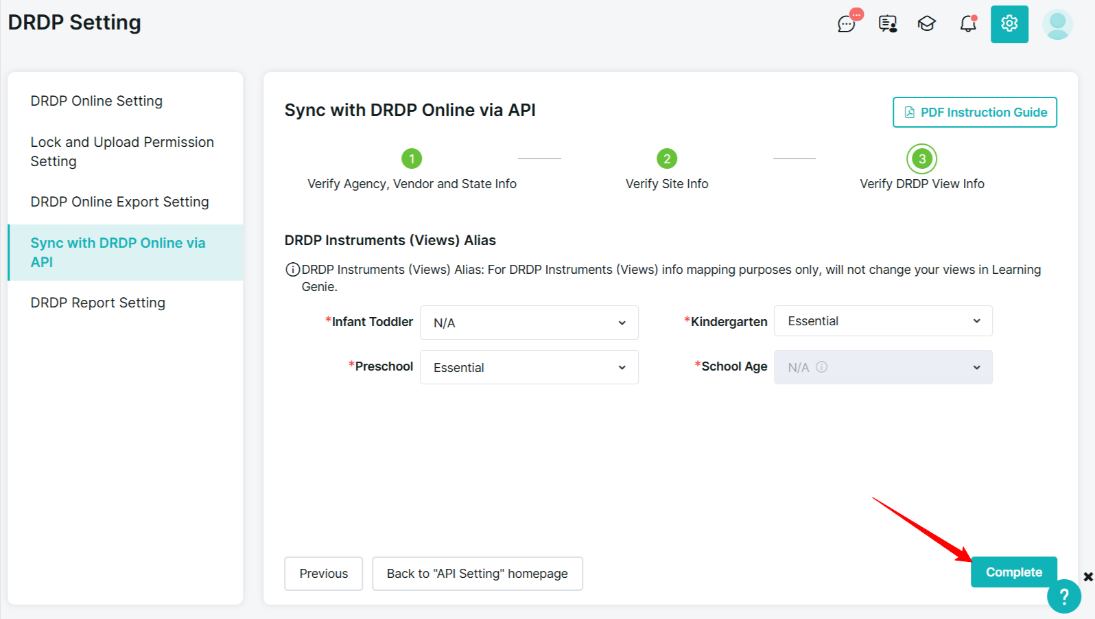 When uploading sites in DRDP Online, special characters are not permitted in site names to maintain system compatibility and prevent synchronization errors. While Learning Genie allows special characters in site names, we provide an option to create an alias specifically for DRDP Online uploads. This allows you to maintain your preferred name in Learning Genie while successfully uploading to DRDP Online.