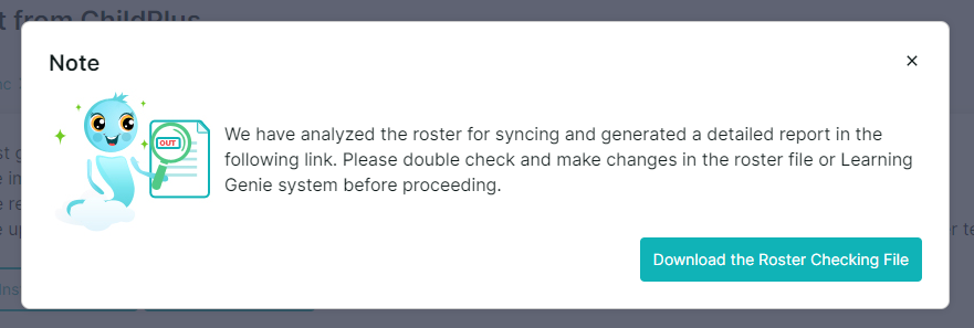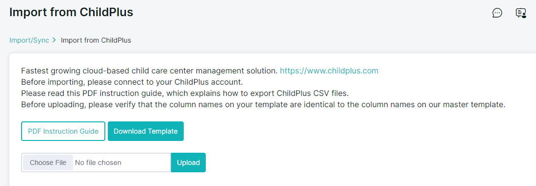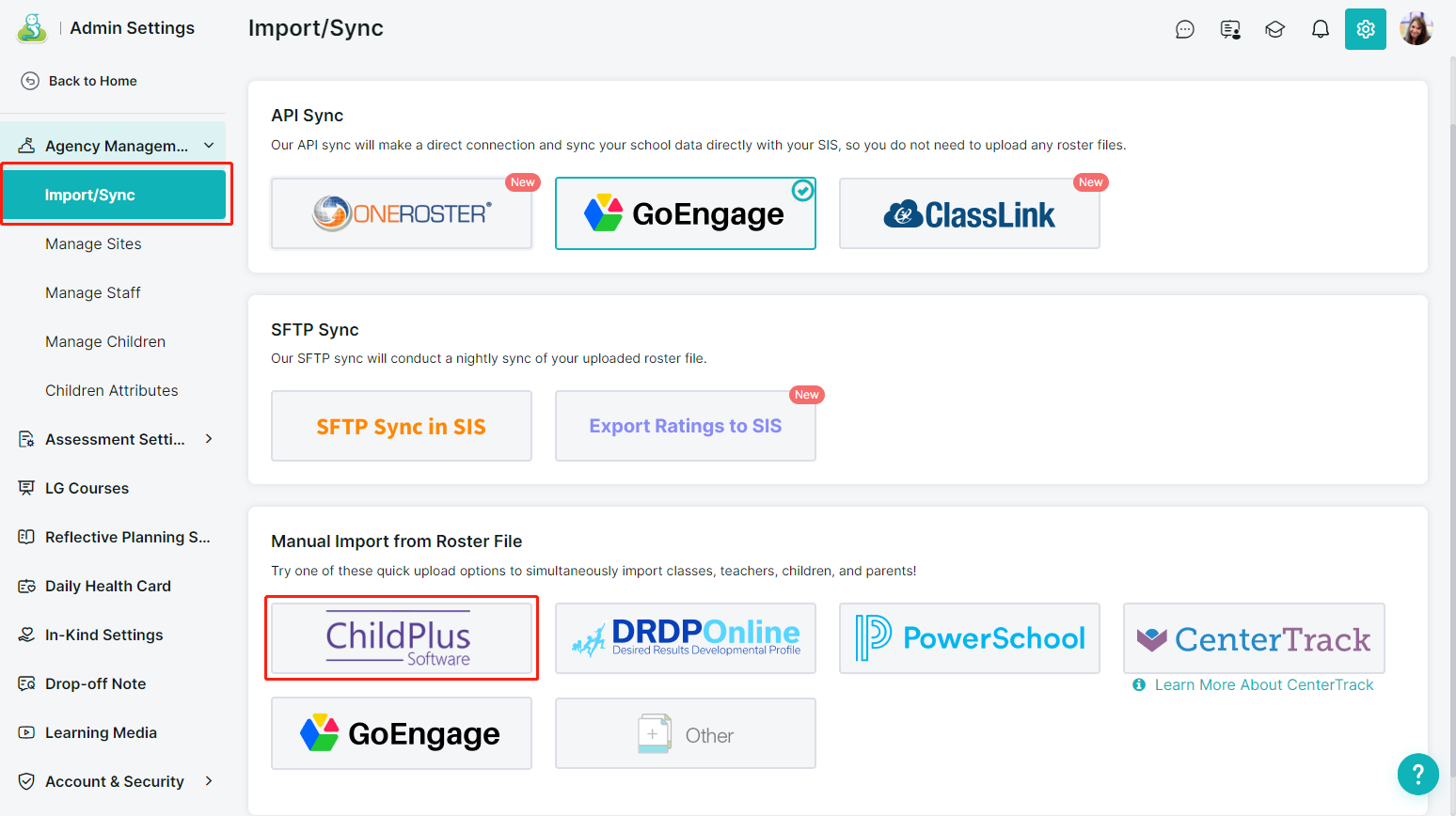 7. Go to Learning Genie > Admin Settings > Agency Management > Import/Sync > ChildPlus