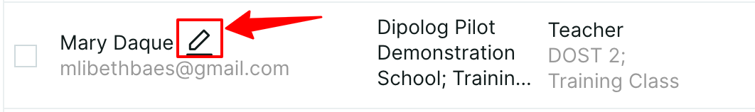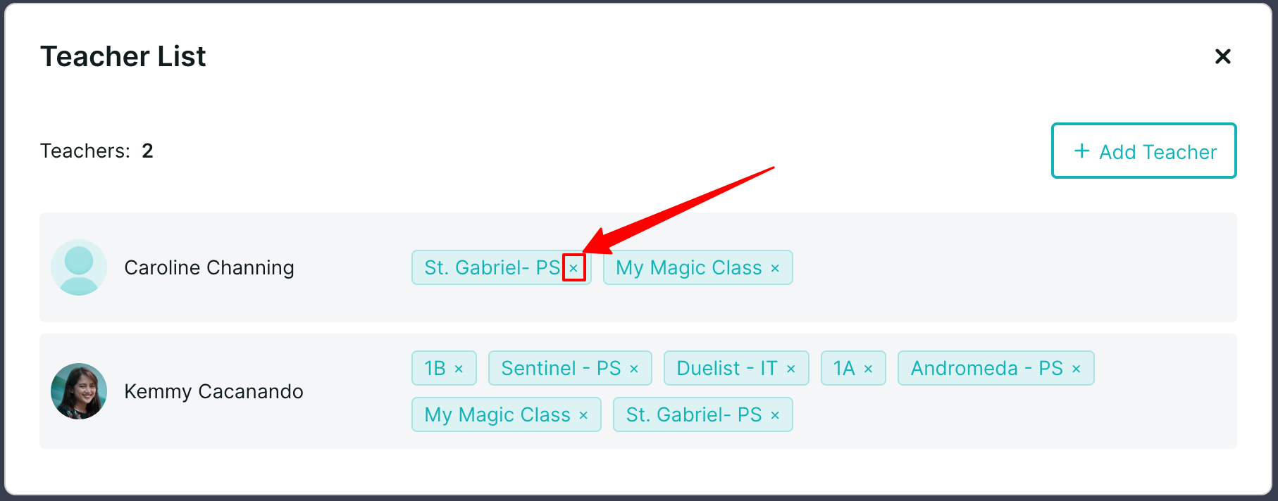 3. In the Teacher List, click the x mark next to the class name to remove the teacher from that class.