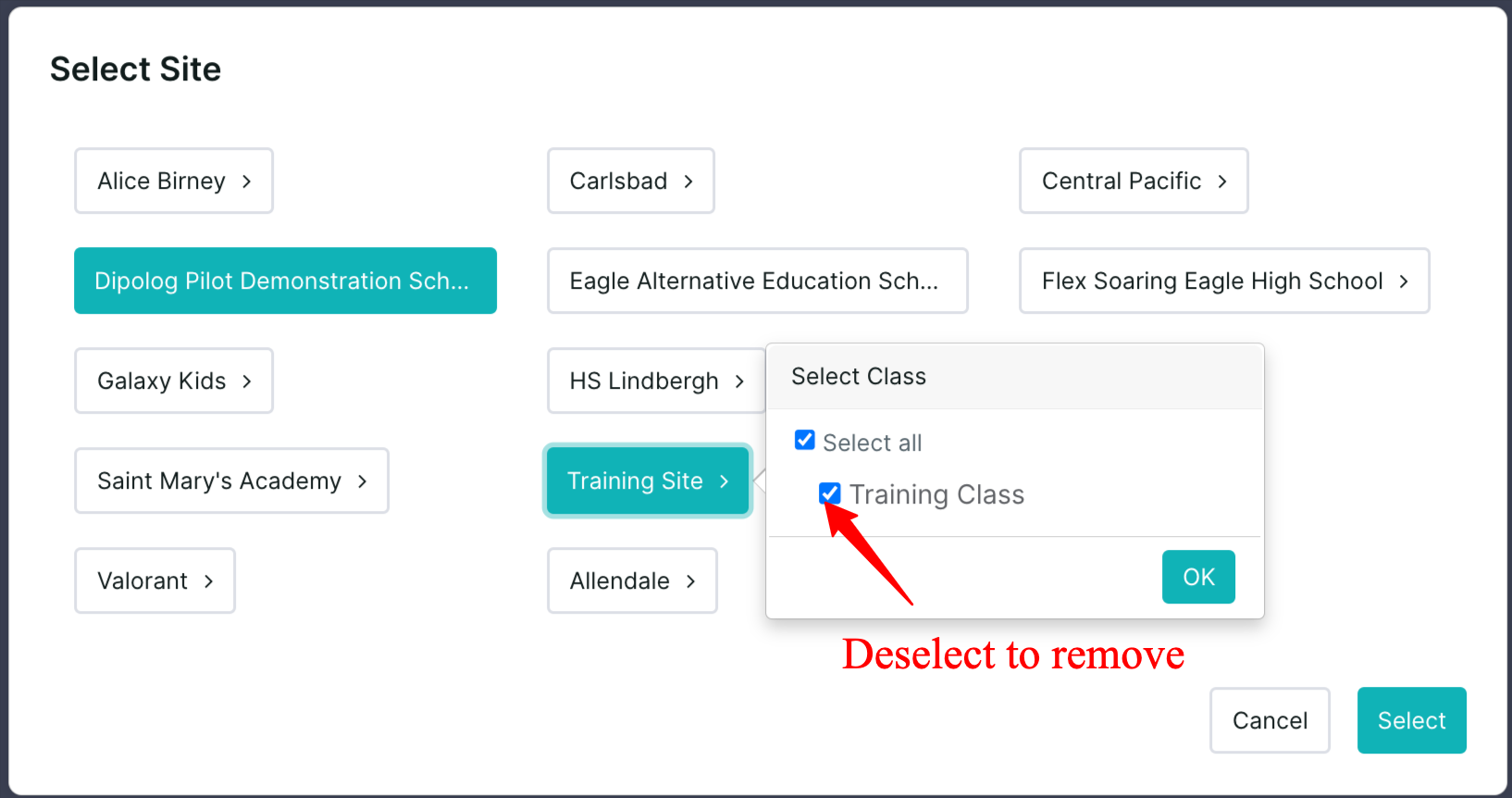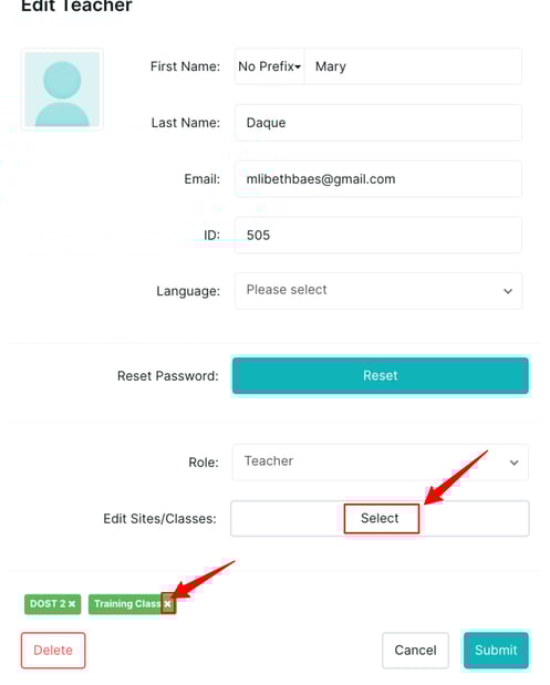 Selecting Edit Sites/Classes, then deselecting the classroom. (You may also reassign them to a different class here if needed.)