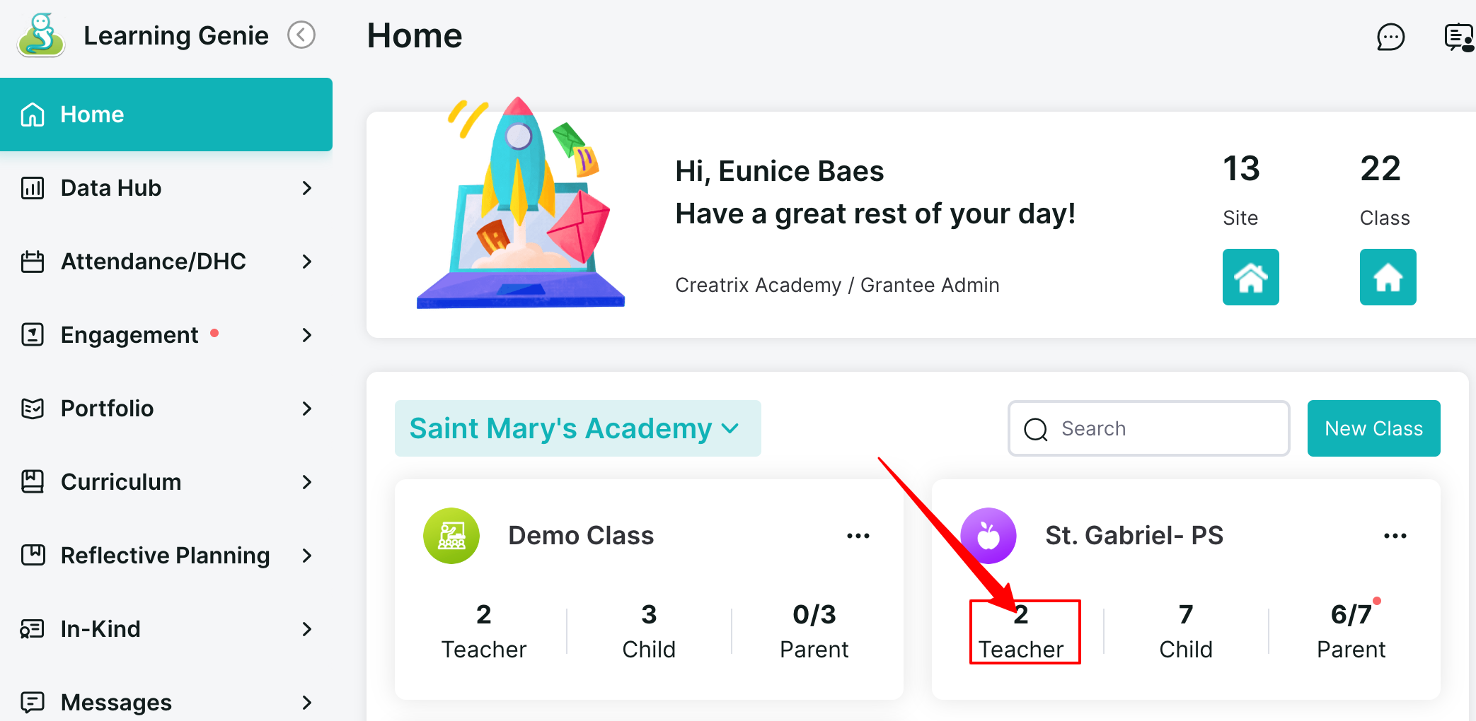 1. On the homepage, navigate to the site and class where the teacher is currently assigned to.