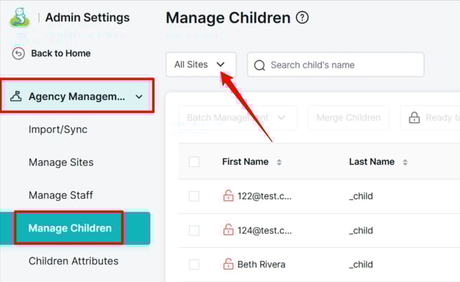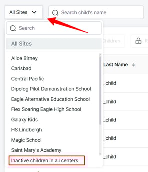 2. Use the Site filter (dropdown) and select "Inactive children in all centers" or simply search the child's name in the search bar.