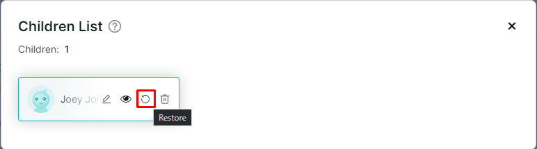3. Hover over the name of the child you want to restore and click on the restore button.