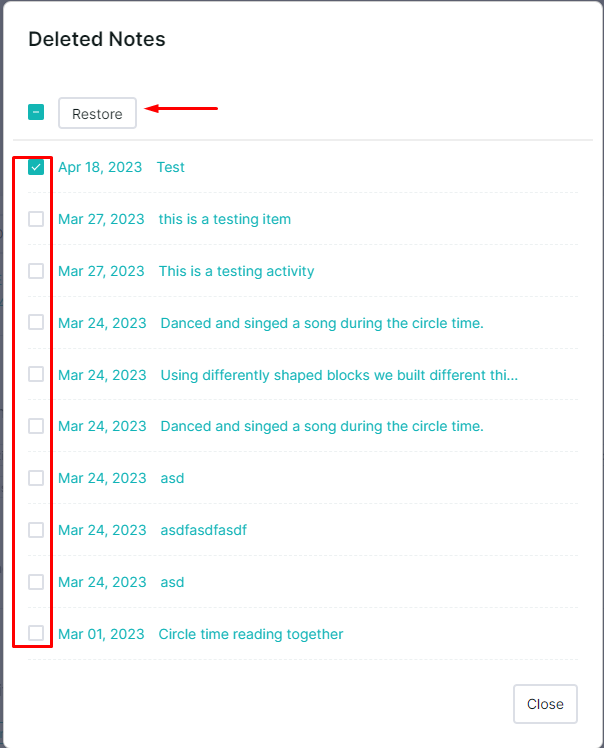 - Select the child whose deleted notes you want to restore, then click the Restore button (🗘).