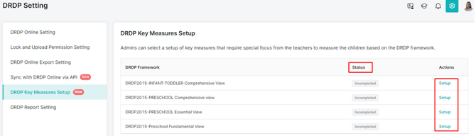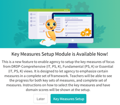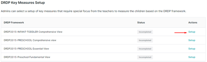- If not, you may go to the “DRDP Key Measures Setup” page on the Admin Settings under Assessment Settings > DRDP Setting, to set up key measures for each DRDP framework when you're ready.