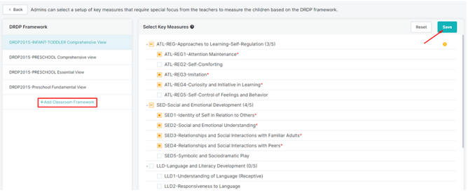 If you need to set up key measures for a framework that is not yet listed, click the “Add Classroom Framework” button to add another DRDP framework.