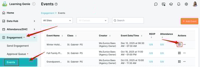 For Admins & Staff: To efficiently record event attendance, navigate to the events tab under “Engagement” and download the unique QR code assigned to your event. Share or display this QR code at the event location to streamline the check-in process.