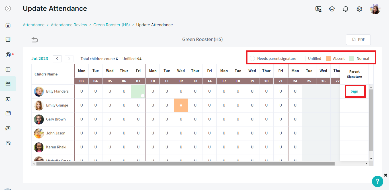As soon as you update a child’s attendance records, the updated data and a signature request will automatically be sent to parents on the app on the same day at 5:30 PM.