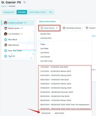 Learning Genie provides a Quick Search feature that allows you to access observations from earlier timeframes or rating periods.