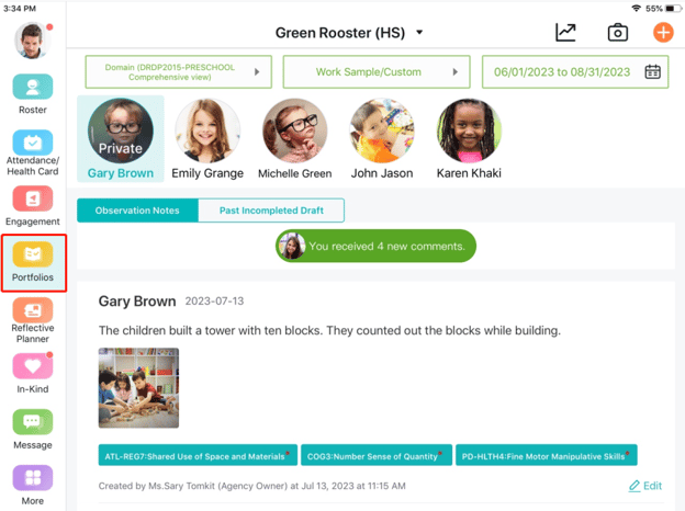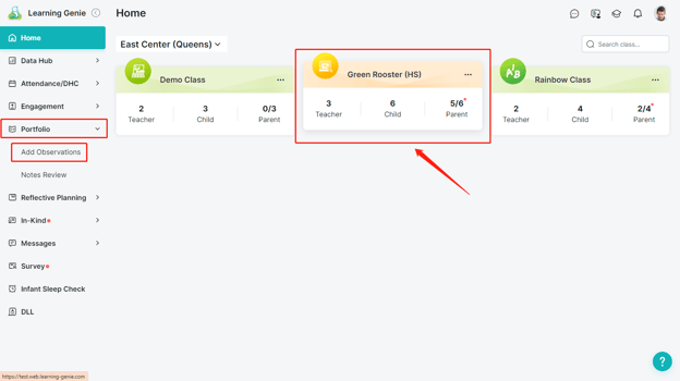 Or you can select "Portfolio" > "Add Observations" from the sidebar, and then select a classroom to proceed.